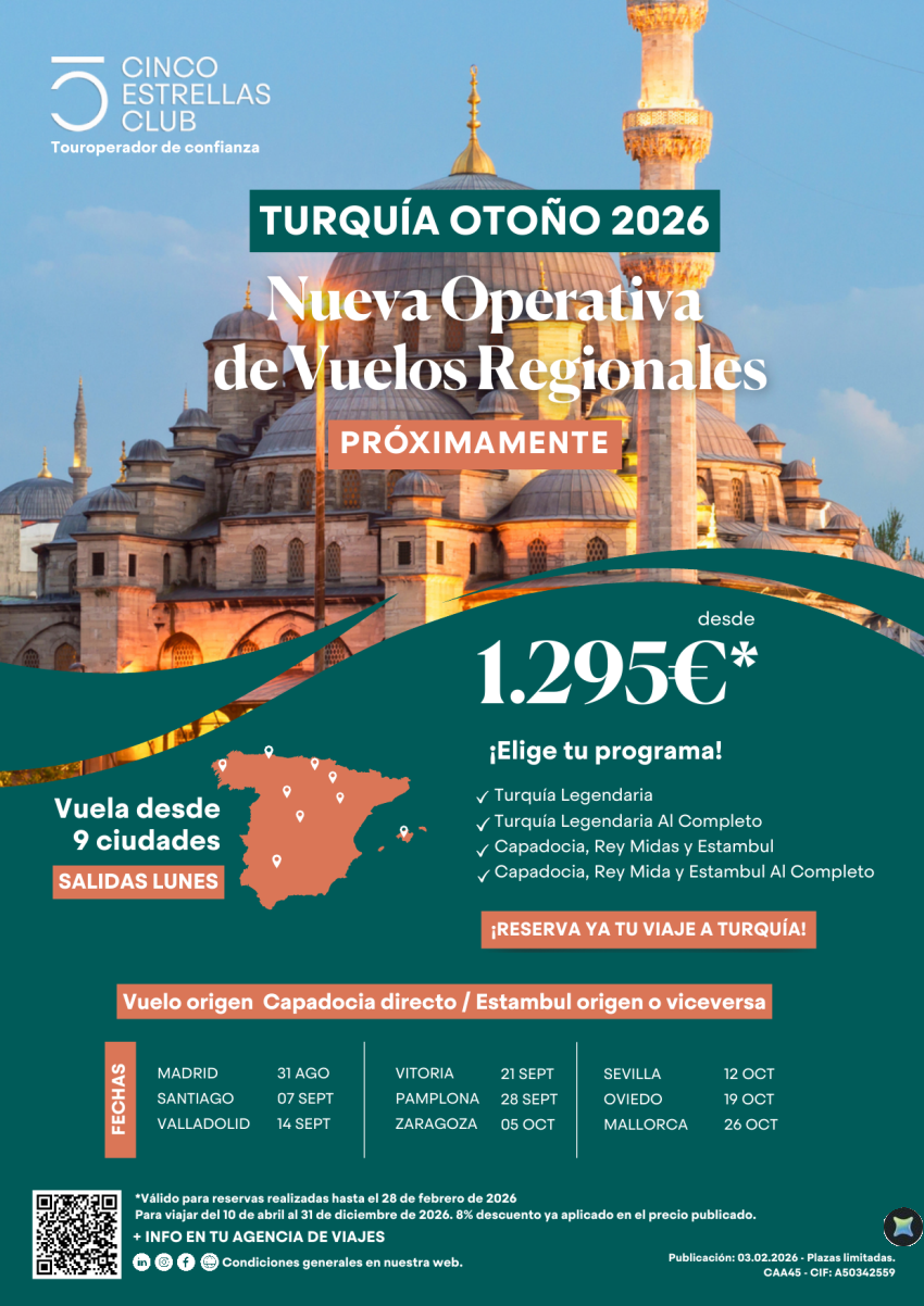 Próximamente Vuelos Regionales Turquía Otoño'26 dsd 1.295€ sal. dsd Scq,Ovd,Pna,Vit,Zaz,Vll, Mad,Svq, Pmi