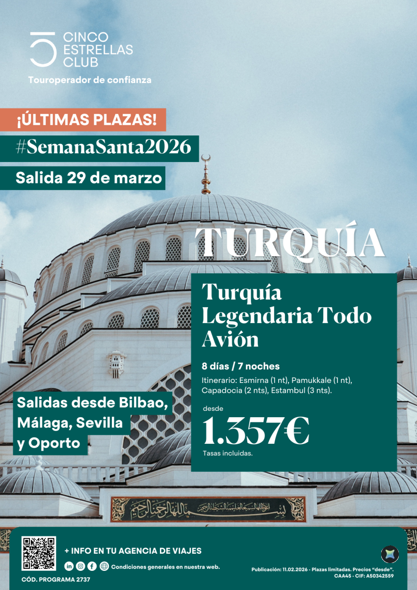 Últimas Plazas Semana Sta. Turquía Legendaria todo avíon 8d/7n dsd 1.357€ sal. 29 marzo ds Bio, Agp, Svq, Opo