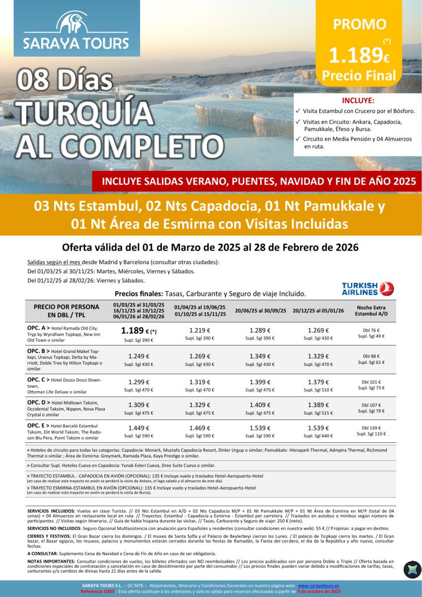 Turquía al Completo 8 días: Estambul, Capadocia, Pamukkale y Esmirna con Visitas Incluidas hasta Feb27
